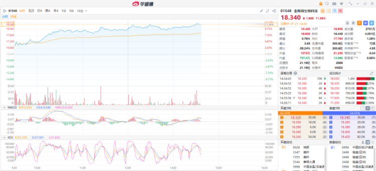 7月21日午后,金斯瑞生物科技 $01548.HK 继续走高,截至发稿,该股上涨11.56%,报18.34港元每股,成交额4.85亿港元。