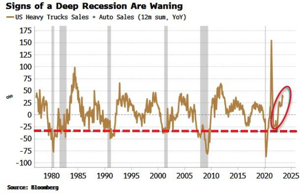 卡车销量也暗示了这一结果。它们是经济活动的一个极好的领先指标。然而,目前该指标正在上升。将其与汽车销售结合起来,我们可以看到,尽管它们去年非常接近衰退水平,但现在看起来很健康。