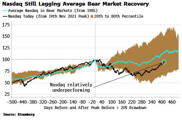 另外,尽管人工智能引领的涨势轰轰烈烈,但科技股总体上看起来仍表现谨慎,信不信由你,事实上纳斯达克100指数的表现低于熊市中的平均水平。