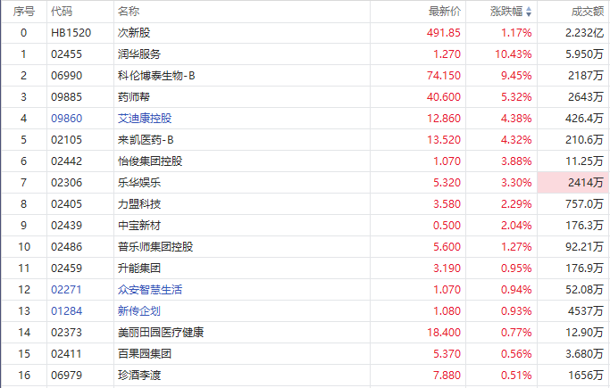 其他次新股方面,润华服务涨超10%,药师帮涨超5%,艾迪康控股、来凯医药-B涨超4%,怡俊集团控股,乐华娱乐涨超3%。近日强势领涨的巨星传奇今日下挫逾5%。