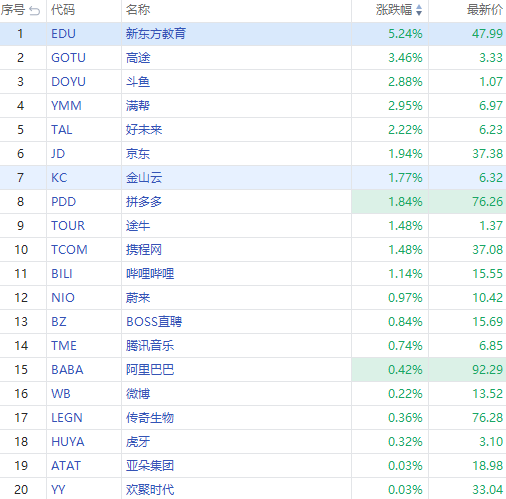 华盛资讯7月21日消息,热门中概股多数上涨,新东方教育涨超5%,高途涨超3%,满帮、好未来涨超2%,金山云、拼多多涨超1%。蔚来涨0.97%,阿里巴巴涨0.42%,微博涨0.22%。2倍做多沪深中国互联网指数 $CWEB 涨超2%,3倍做多富时中国50指数 $YINN 涨超1%。