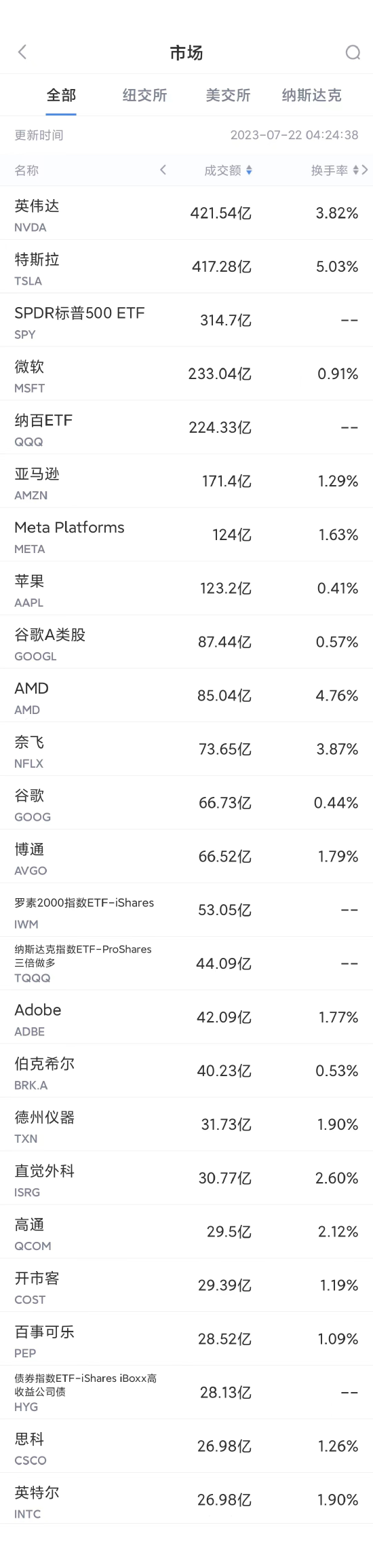 第20名英特尔收高1.95%,成交27亿美元。