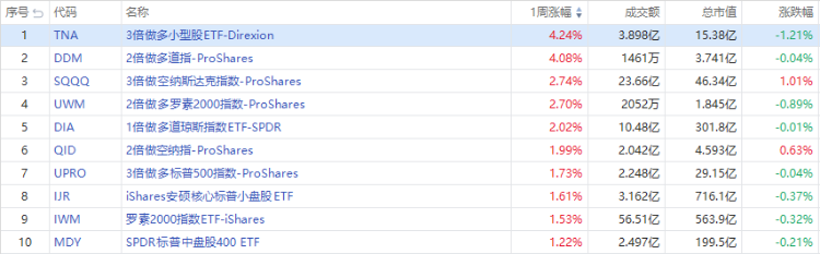 指数ETF方面,3倍做多小型股ETF $TNA 周涨超4%,代表中小盘股的2倍做多罗素2000指数ETF $UWM 周内也涨超2%,虽不及上周上涨幅度,但依然领跑股指ETF。此前高盛策略师在一份说明中预计,代表小盘股基准的罗素2000指数在未来12个月回报将达到14%,该行曾预测大盘股标准普尔500指数在未来一年将为投资者提供9%的回报,意味着大盘股未来表现或落后于小盘股。