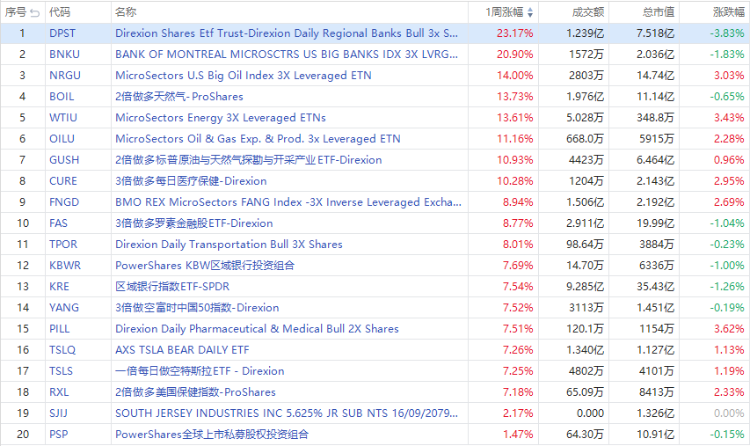 此外,2倍做多天然气 $BOIL 周内涨超13%,3倍做多每日医疗保健 $CURE 周内涨超10%,一倍每日做空特斯拉ETF $TSLS 周内涨超7%