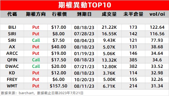 2、上周四暴涨天狼星XM控股 $SIRI ,周五期权成交方面迎来多空激战。7月28日到期、行权价在8美元看跌期权和8月4日到期、行权价在7.5美元看涨期权吸引市场抢筹。