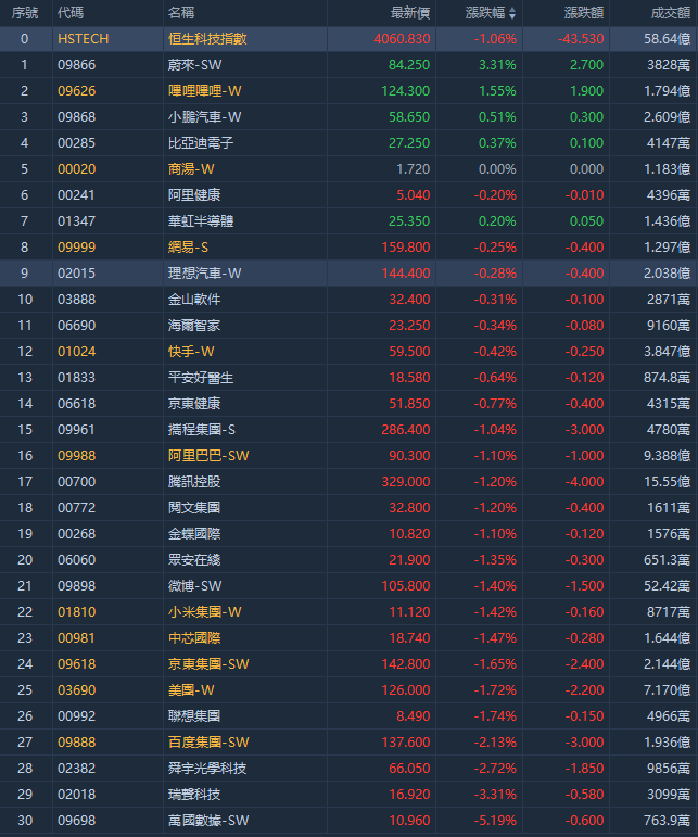 科网股普跌,百度跌超2%,美团-W、腾讯控股、京东集团-SW、小米集团均跌超1%。