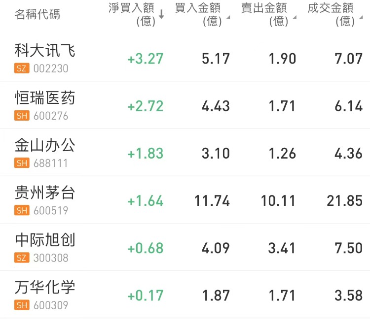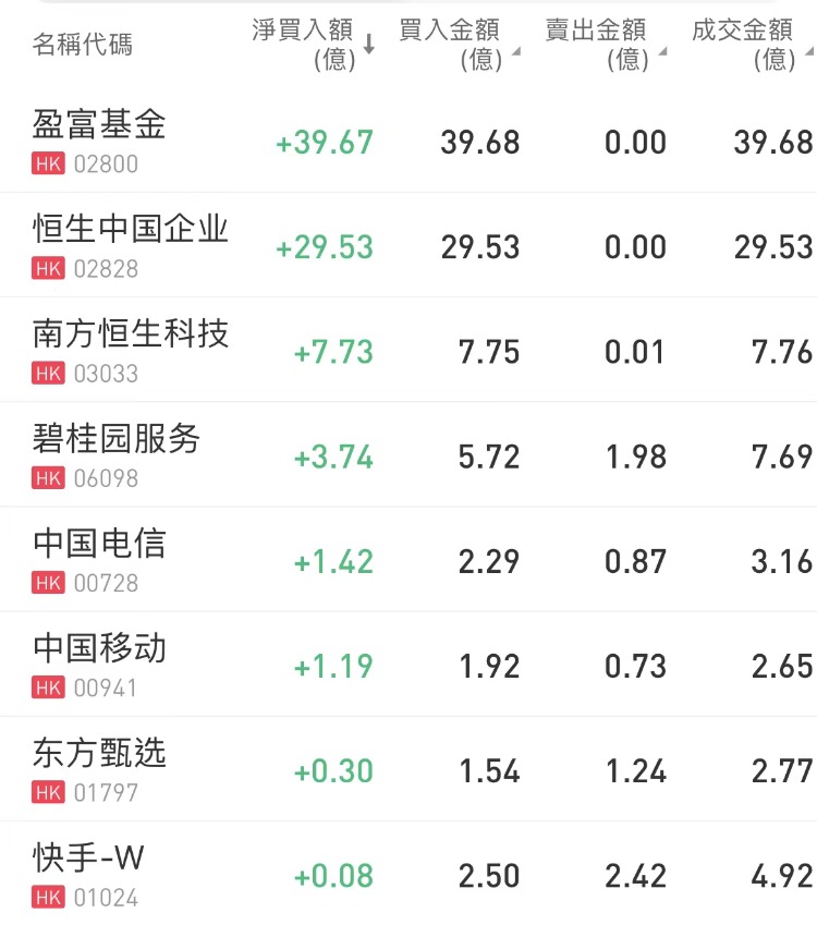 盈富基金、恒生中国企业、南方恒生科技、碧桂园服务分别获净买入39.67亿港元、29.53亿港元、7.73亿港元、3.74亿港元;腾讯控股净卖出额居首,金额为1.86亿港元。