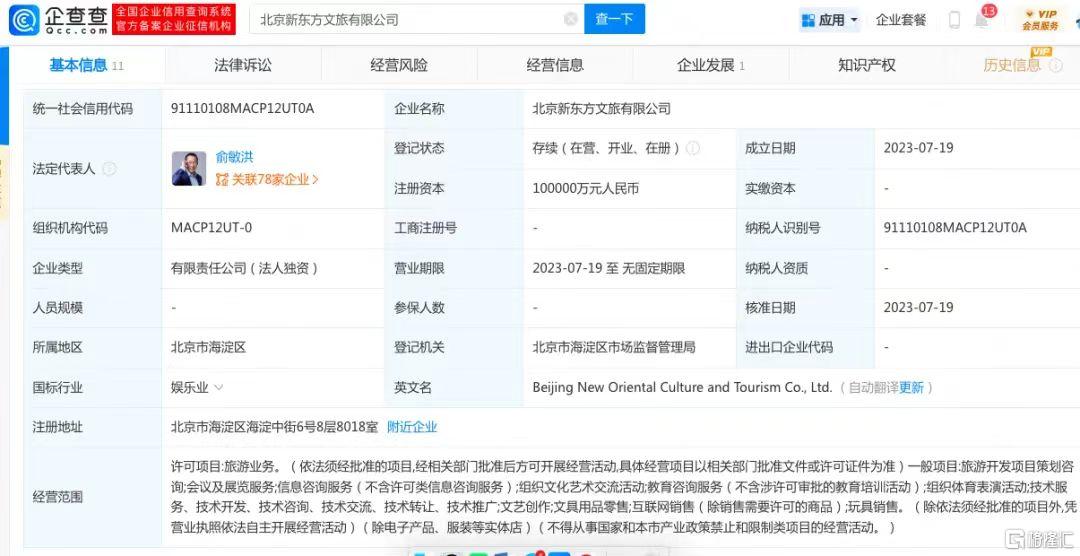 公开资料显示,7月19日,北京新东方文旅有限公司已经成立,注册资本10亿元,法定代表人、董事长为俞敏洪。