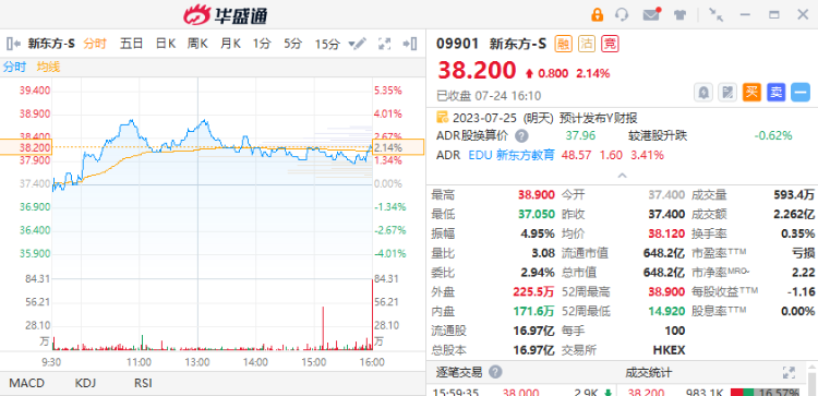 受消息影响,新东方近日股价接连走高,近10个交易日股价累计涨超24%,今日收涨2.14%,报38.2港元,总市值649.16亿港元,股价创2021年7月23日以来新高,成交额2.26亿港元。