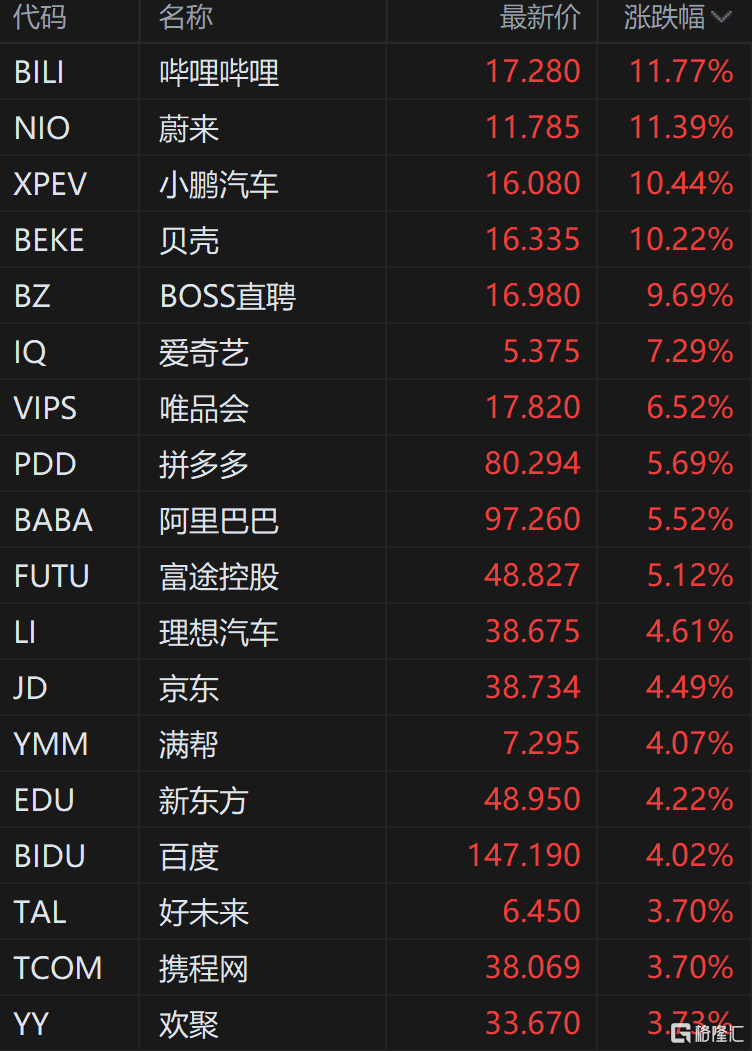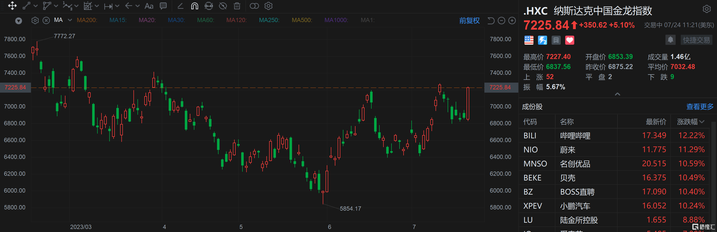 格隆汇7月24日丨纳斯达克中国金龙指数涨超5%,报7225.84点。哔哩哔哩、蔚来涨超11%,小鹏汽车、贝壳涨超10%,BOSS直聘涨超9%,唯品会涨超6%,拼多多、阿里巴巴、富途涨超5%,理想汽车、京东、新东方、百度涨超4%。