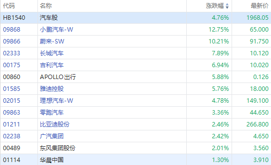 新能源车大涨,其中,小鹏汽车-W(09868)涨12.75%,报65港元;蔚来-SW(09866)涨10.21%,报91.75港元;理想汽车-W(02015)涨4.78%,报149.1港元。