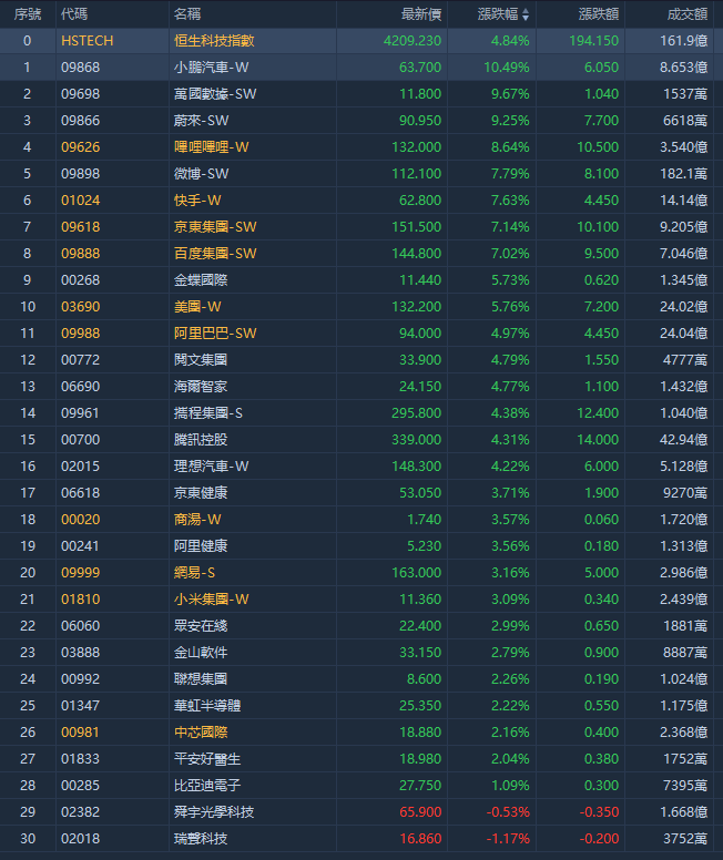 个股方面,万国数据-SW涨超9%,哔哩哔哩-W涨超8%,百度集团-SW、快手-W、京东集团-SW均涨超7%;阿里巴巴-SW、美团-W涨超4%;商汤-W、小米集团-W,网易-S涨超3%。