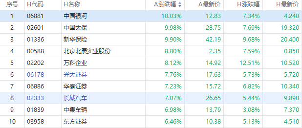 截至发稿,中国银河A股涨停,H股现超7%;中国太保A股涨停,H股现涨超7%;长城汽车A股涨超7%,H股现涨超5%。