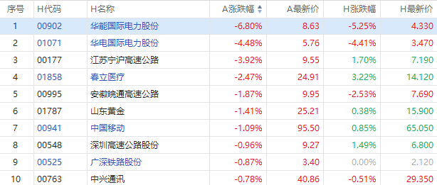 华能国际电力股份A股跌超6%,H股现跌超5%;华电国际电力股份A股跌超4%,H股现跌超4%;春立医疗A股跌超2%,H股现涨超3%。