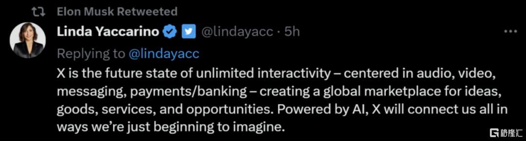 推特新任首席执行官琳达·亚卡里诺则称,X是无限交互的未来形态——以音频、视频、消息、支付/银行为中心,创建一个充满创意、商品、服务和机会的全球市场。在人工智能支持下,X将会连接所有人。在这方面,我们才刚刚处于想象的起点。