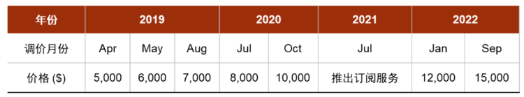 特斯拉的FSD在2019年以前,是EAP的增持功能。但从2019年4月起,FSD Beta被作为单独的功能进行销售。由于FSD在测试版中经历了几轮大涨价,这使得市场越来越相信马斯克所说的,未来单车售价可以降至更低,软件才是最大的利润释放端。从下图中看,FSD的价格已由2019年的5000美元上涨至2022年的15000美元。随着售价越来越高,特斯拉也推出FSD按月订阅的模式,价格为99(此前已购买EAP)或199美元/月的模式。