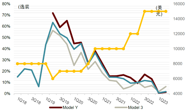 根据上述Teslike调查问卷数据,进入2022年,FSD选装率降到10%左右,对应的是1M22 FSD提价至12,000美元;进入2023年,FSD的选装率更是跌至2%左右,对应的是15,000美元的售价。