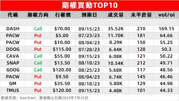 2、谷歌受财报利好,盘后大涨5%。行权价在120美元、8月25日到期的看涨期权获得市场资金异动,开盘后有望上涨82%。