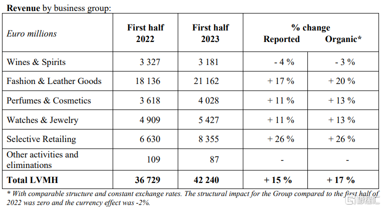按部门分,除了葡萄酒和烈酒部门因高基数因素影响外,LVMH所有业务集团在上半年中都实现了两位数的有机收入增长。