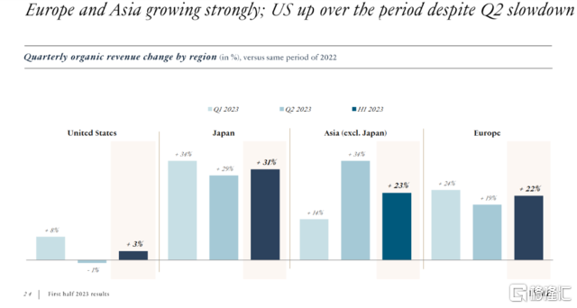 按地区分,第二季度LVMH在美国收入出现1%的下跌,日本和欧洲分别大涨29%和19%,中国所在的亚太市场表现最为强劲,同比大涨34%。上半年该集团美国销售额增长放缓至3%,远不及上年同期的24%,另外亚太地区、日本和欧洲则延续双位数的强劲增幅。