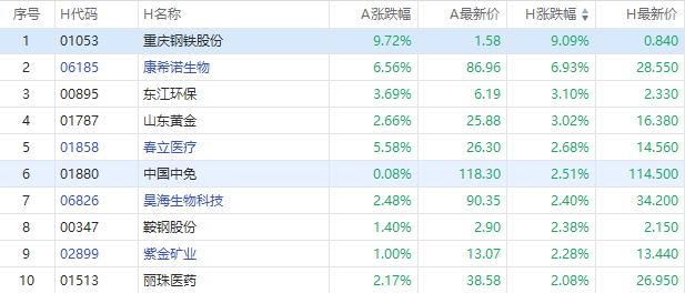 截至发稿,重庆钢铁股份A股涨停,H股现超9%;康希诺生物A股涨超6%,H股现涨超6%;东江环保A股涨超3%,H股现涨超3%。