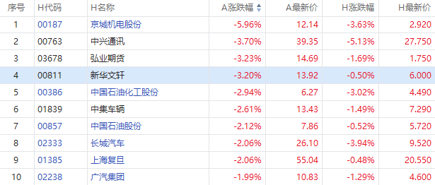 京城机电股份A股跌近6%,H股现跌超3%;中兴通讯A股跌超3%,H股现跌超5%;弘业期货A股跌超2%,H股现跌超1%。