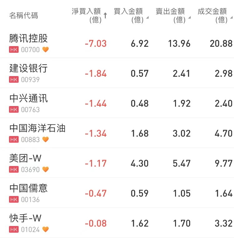 盈富基金、恒生中国企业、南方恒生科技、小鹏汽车-W分别获净买入37.08亿港元、31亿港元、5.02亿港元、3.25亿港元;腾讯控股净卖出额居首,金额为7.03亿港元。值得留意的是,南向资金昨日曾净买入腾讯控股12.86亿港元。