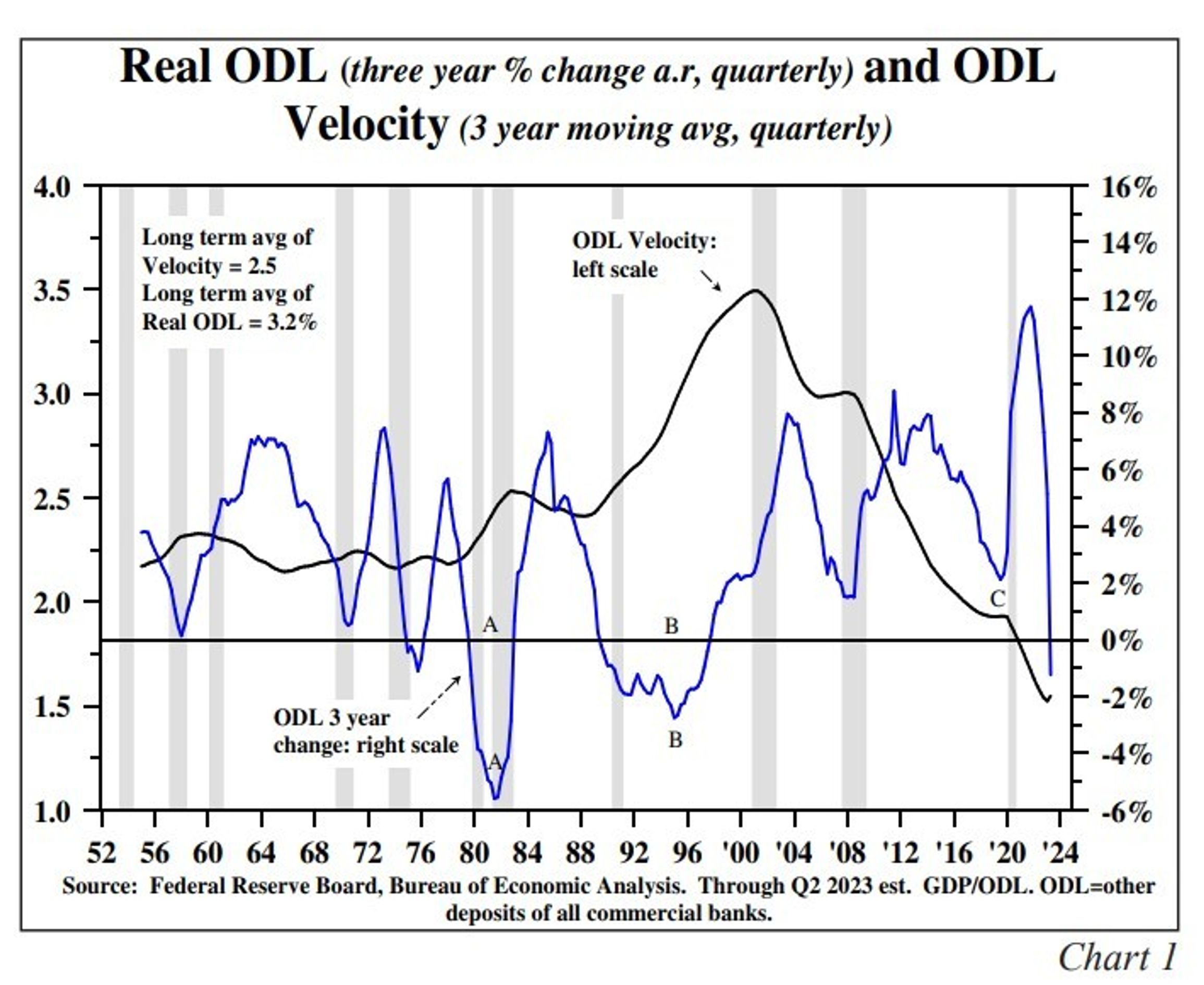 除了上述图表外,他们还结合所谓的其他存款负债(ODL)指出流动性的收紧。ODL即银行的所有存款减去定期存款,是M2的良好替代指标。经通胀调整后,ODL在过去36个月内已持续下降,并且在12个月和24个月内加速收缩。他们表示,“2020-21年被创造出来支撑支出和通胀的资金山已经被消除”。