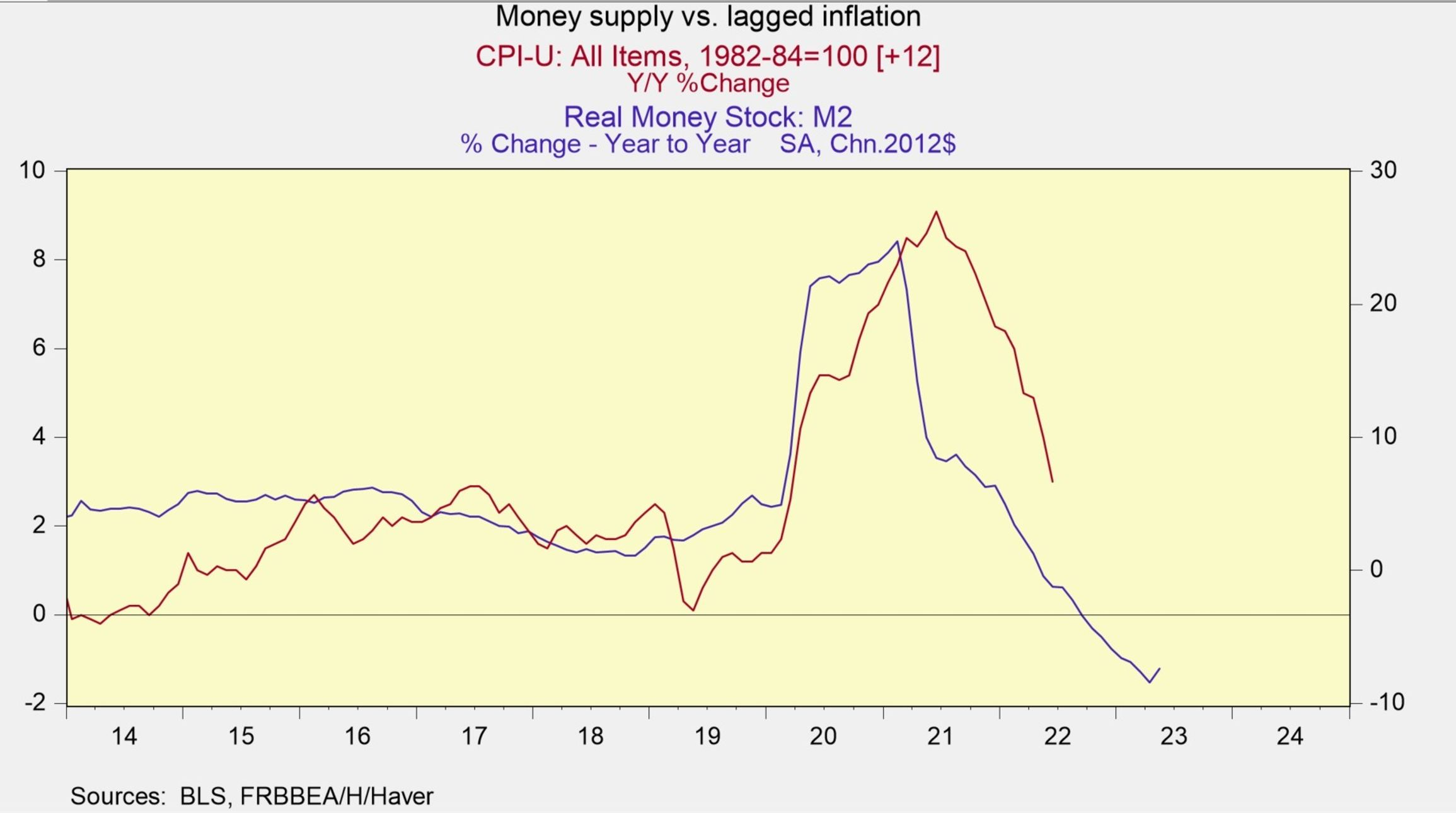 长期担任西方资产管理公司(Western Asset Management)首席经济学家、现为卡拉菲亚海滩专家博客(Calafia Beach Pundit)作者的斯科特•格兰尼斯(Scott Grannis)制作了一张图表,显示了衡量货币供应量的M2(蓝线)是如何导致通胀(红线)的,这一传导过程大约滞后了一年。