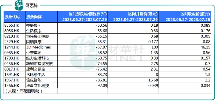 财华社根据同花顺i问财数据统计,整理出近一个月港股市场跌幅超过50%的个股,如下图所示,试图发现其背后的共通点,以达到避坑的目的,供广大投资者参考。