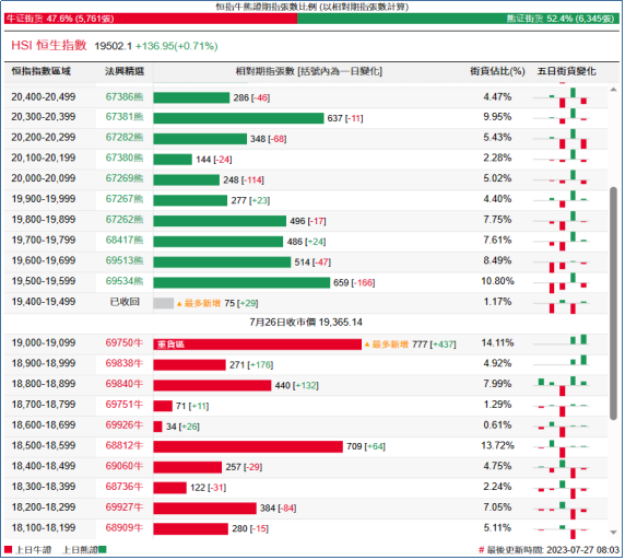 街货分布方面,至周三,恒指牛证街货重货区间主要在收回价18600点至19100点之间,累计相当约1593张期指合约; 恒指熊证街货重货区主要在收回价19500点至20000点之间,累计相当约2432张期指合约。