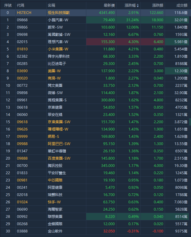 个股方面,万国数据-SW涨超6%;小米集团-W涨超4%;美团-W、商汤-W涨超2%;腾讯控股、阿里巴巴-SW、哔哩哔哩-W涨、百度集团-SW、网易-S均涨超1%。