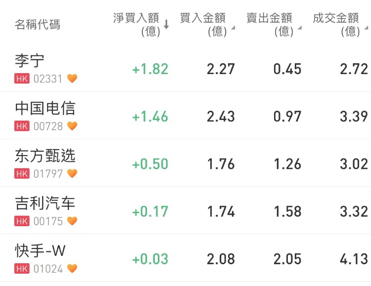 小鹏汽车-W、恒生中国企业、盈富基金分别遭净卖出10.7亿港元、9.11亿港元、7.18亿港元;李宁、中国电信分别获净买入1.82亿港元、1.46亿港元。
