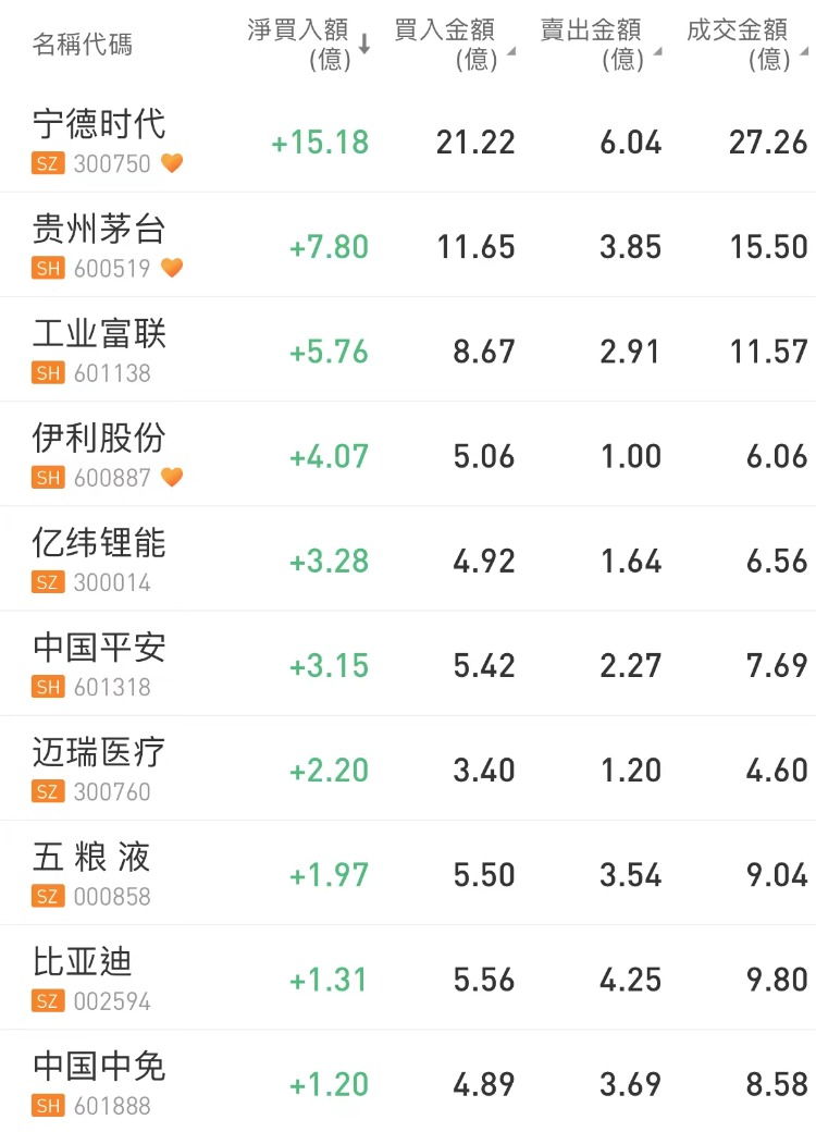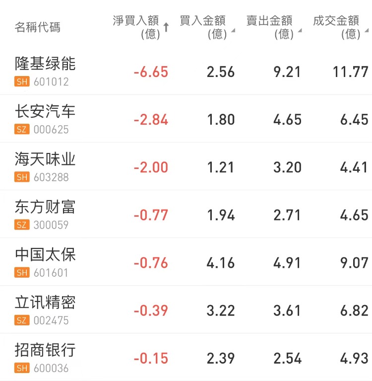 宁德时代、贵州茅台、工业富联分别获净买入15.18亿元、7.8亿元、5.76亿元。隆基绿能净卖出额居首,金额为6.65亿元。