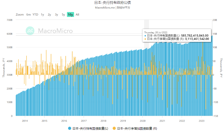 根据日本央行公布的数据,截至7月20日,央行持有日本国债的总量在585万亿日元,占比超去年日本GDP的60%,可以说日本央行是日本国债的最大股东。