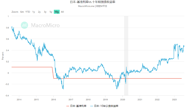 2016年日本央行开始实施YCC控制,将10年期公债殖利率维持在靠近0%的低点,并在过去6年微幅调整增加。现行日央行YCC政策设定,10年期日本公债的殖利率波动区间为正负0.5%。一旦殖利率可能超过0.5%,日本央行就会买入日债。