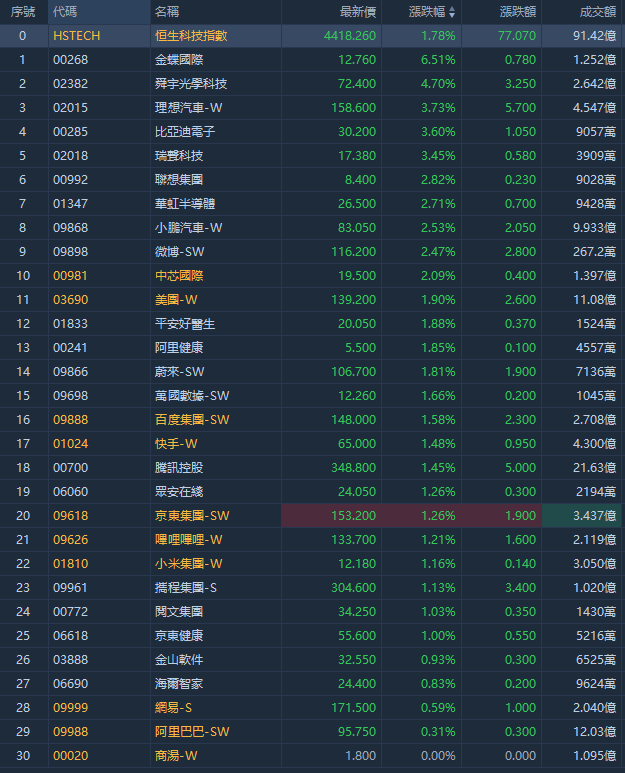 个股方面,金蝶国际领涨,现涨6.51%;舜宇光学科技涨超4%,瑞声科技涨近3%,比亚电子、华虹半导体跟涨。