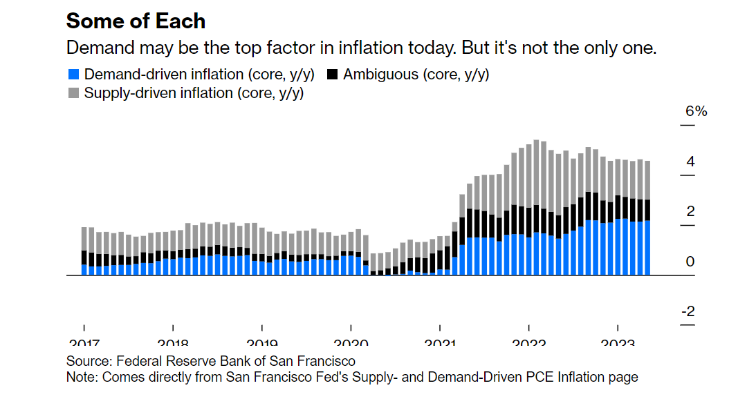 但2021-2022年的这轮通胀很难说是典型的经济过热的案例,在当前背景下,有许多问题需要考虑。疫情时期导致的供应链中断在经济史上是独一无二的,许多观察人士怀疑,有可能在一定程度上冷却通胀而无需抑制需求。旧金山联储研究人员此前的分析表明,供应因素可能在2022年初的大部分时间里推动了经济增长。但从那以后,需求方面可能暂时占据了主导地位。