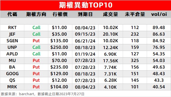 3、英特尔二季度业绩及三季度指引超预期,美股周四盘后收涨超8%。期权隔夜成交54.6万张较上一日猛增2.5倍,高于30日平均成交量3倍多;其中看涨期权成交32万张,累计金额约3637万美元。