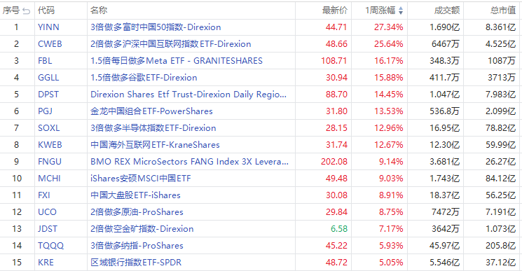 ETF方面,3倍做多富时中国50指数-Direxion $YINN 本周狂飙27.34%,居涨幅榜首;2倍做多沪深中国互联网指数ETF $CWEB 累升逾25%,中国海外互联网ETF $KWEB 一周涨12.67%。