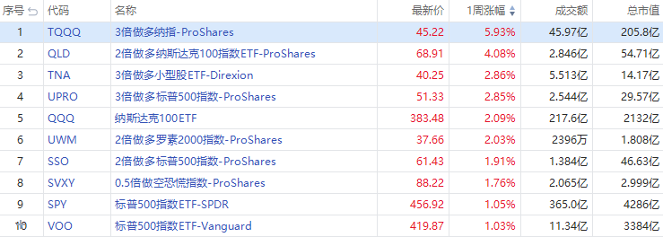 指数ETF方面,本周龙头科技股继续上涨,纳指实现三周连涨。3倍做多纳指-ProShares $TQQQ 周内升幅近6%,纳斯达克100ETF $QQQ 累升逾2%,2倍做多纳斯达克100指数ETF $QLD 涨超4%。