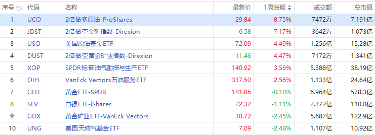 ETF方面,2倍做多原油 $UCO 周内涨8.75%居首,美国原油基金ETF $USO 涨4.47%,SPDR标普油气勘探与生产ETF $XOP 、VanEck Vectors石油服务ETF $OIH 本周跟随收高,分别累涨3.56%、2.56%。