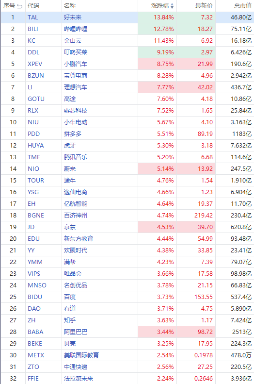华盛资讯7月28日消息,热门中概股集体拉升,截至发稿,好未来涨近14%,哔哩哔哩涨近13%,慧荣科技涨超12%,金山云涨超11%,叮咚买菜涨超9%,小鹏汽车涨近9%,理想汽车、高途、雾芯科技涨超7%,拼多多、蔚来涨超5%,京东、新东方教育、腾讯ADR涨超4%,阿里巴巴涨超3%