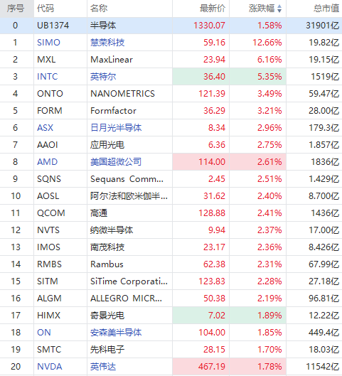 美股半导体概念股走强,截至发稿,英特尔绩后涨超5%,日月光半导体、AMD、高通、纳微半导体涨超2%,安森美半导体、英伟达涨超1%。
