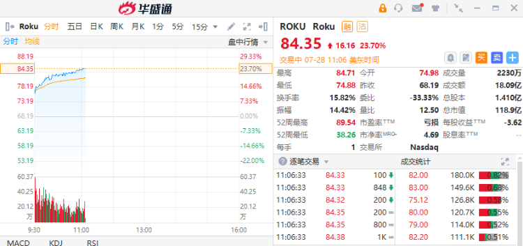Roku绩后涨近24%,公司第二季度营收8.47亿美元,超预期的7.7亿美元;每股亏损0.76美元,低于预期的亏损1.26美元;活跃账户达7350万,同比增长16%。