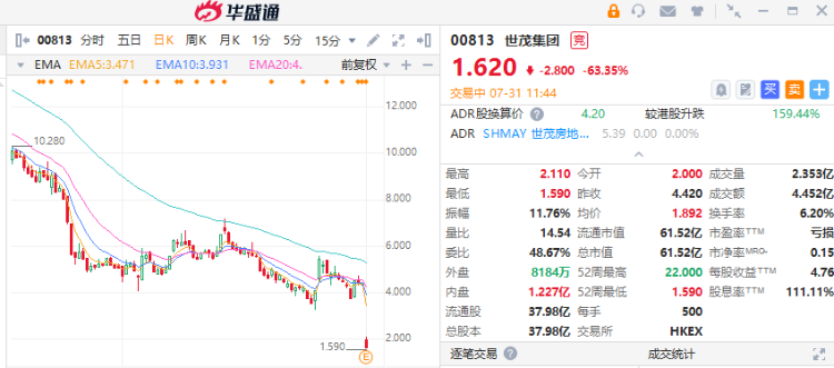 世茂集团(00813)复牌低开54.75%,跌幅现扩大至63.35%报1.62港元,成交额4.45亿港元,市值61.52亿港元。