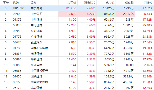 中资券商股延续上周升势,截至发稿,中金公司涨6.27%报17.62港元,成交额2.317亿港元;中信证券涨3.6%,广发证券涨超3%,中州证券涨4%,国泰君安国际、光大证券跟涨。