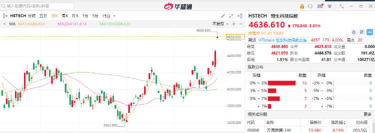 7月31日,恒指继上周大涨后继续强势表现,今日高开1.61%,站上两万点关口!恒生科技指数更是再度上演跳空高开的暴力强攻态势,以“空中加油”的形态大涨超4%!成份股中,小鹏汽车涨超12%,蔚来涨超11%,哔哩哔哩涨超8%,理想、京东涨超6%,快手、美团涨超4%。