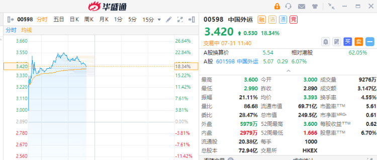 中国外运(00598)早盘一度涨超22%,截至发稿,涨18.34%,报3.42港元,成交额3.14亿港元。公司股价今年以来大涨45%。