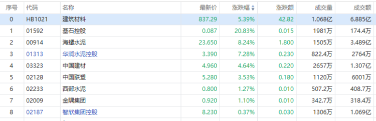 7月31日讯,港股建材水泥股集体走高,截至发稿,基石控股涨超20%,华新水泥涨超9%,海螺水泥涨超8%,华润水泥控股涨超7%,中国建材涨超4%。
